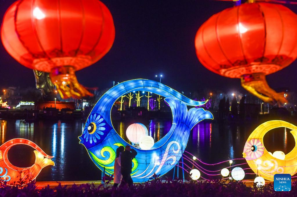 Tourists enjoy lanterns along the Dagu River scenic spot in Jiaozhou of Qingdao city, East China's Shandong province, Jan 18, 2023. [Photo/Xinhua]