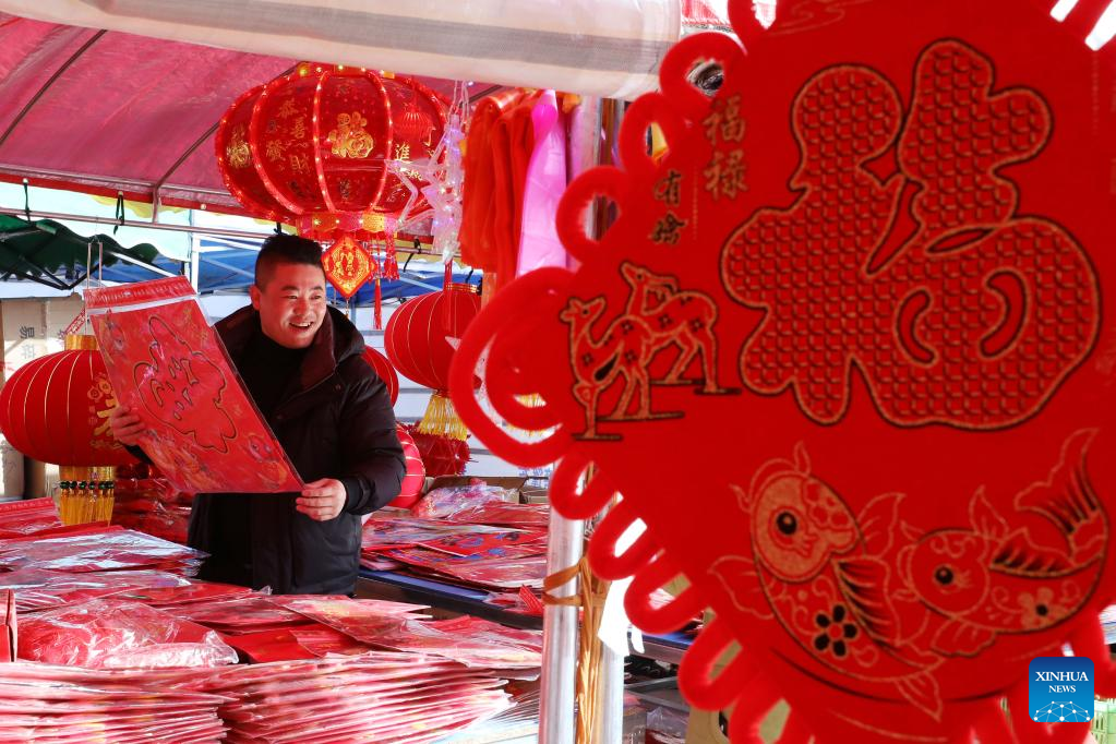 A villager selects decorations for the Spring Festival at a fair in Wenquan subdistrict in Wenxian county, Jiaozuo city of Central China's Henan province, Jan 19, 2023. [Photo/Xinhua]