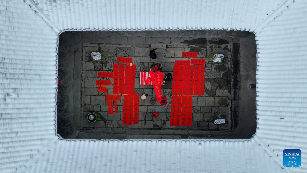 This aerial photo taken on Jan 18, 2023 shows villagers writing couplets for the Spring Festival in Longchi village of Taohuayuan subdistrict in Youyang Tujia and Miao autonomous county, Southwest China's Chongqing municipality. [Photo/Xinhua]