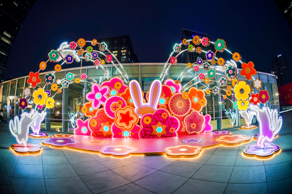 Themed "Rabbit Leaping on Flowers to Start a New Journey", the light-up on the seventh floor features lovely rabbits jumping out of colorful flowers, setting the stage for an auspicious, prosperous year ahead.