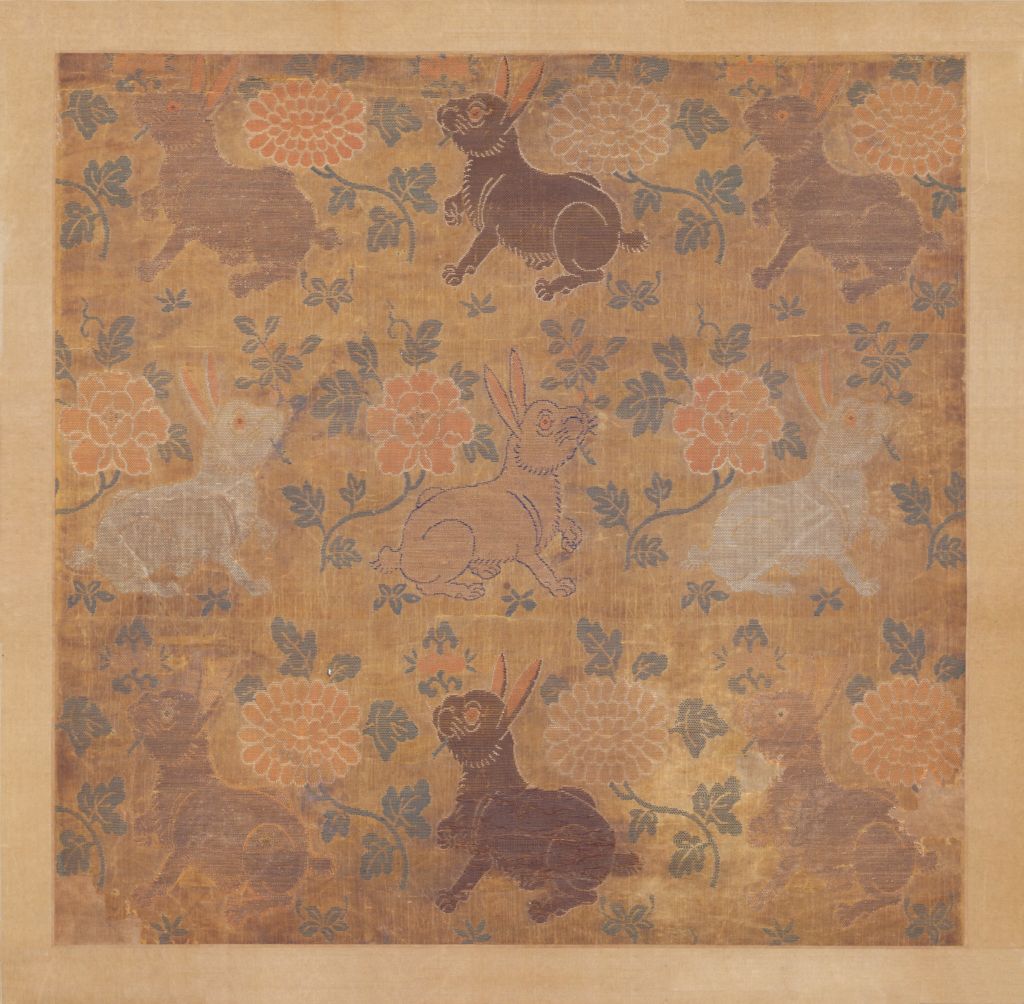 A product of Nanjing yunjin brocade, this is a fine piece of gauze dating back to the early Ming Dynasty (1368-1644). Three lines of rabbits, chrysanthemums and peonies have been woven into a yellow cloth. The rabbits are looking up, some holding osmanthus in their mouths and others holding lingzhi fungi.