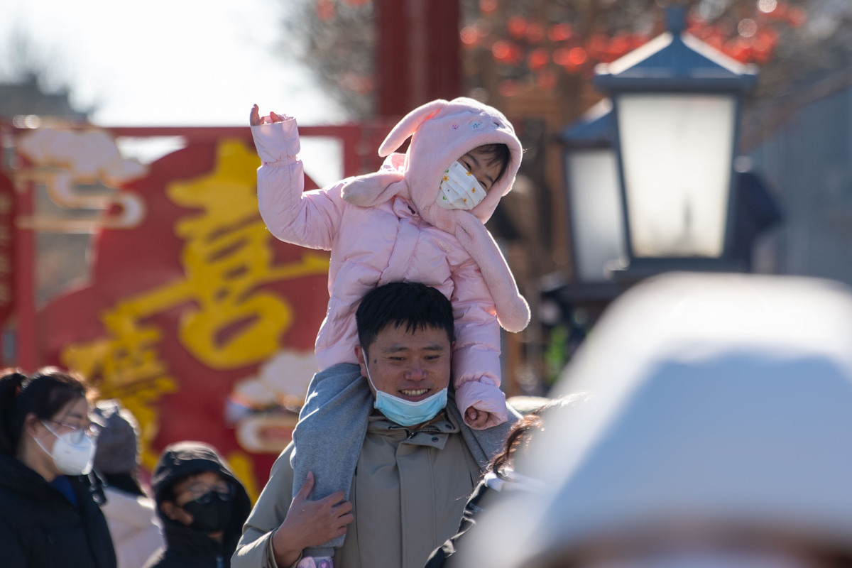 A father holds his daughter at Qianmen Street, a landmark commercial street in Beijing, Jan 27, 2023. [Photo/IC]