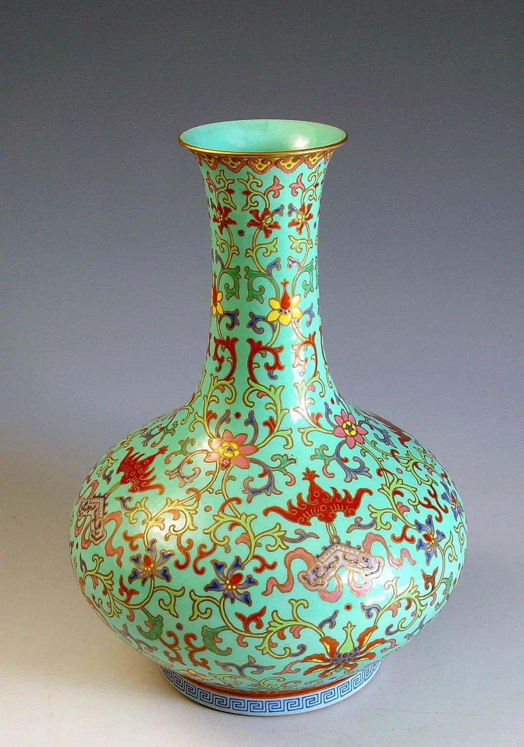 Famille-rose vase with floral and bat patterns on a green background, Qianlong reign (1736-1795) of the Qing Dynasty (1644-1911) [Photo/Official WeChat account of the Shenyang Palace Museum]