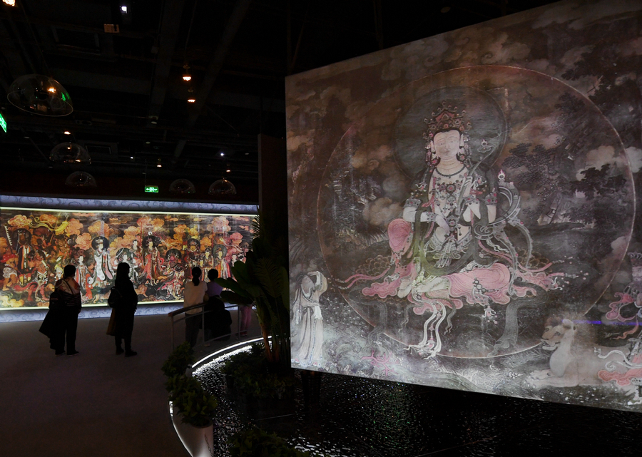 Visitors appreciate the Buddhist murals which are nearly 600 years old, at the newly opened Fahai Temple Mural Art Center in Beijing on Jan 31, 2023. [Photo/Xinhua]