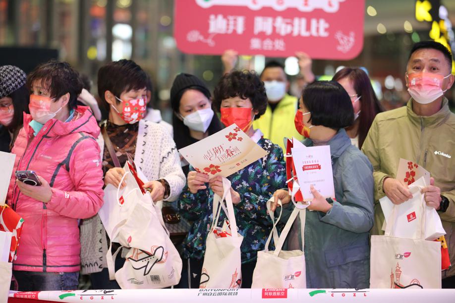 Chinese tourists prepare to board an Emirates Airlines flight at Guangzhou Baiyun International Airport early on Monday. [Photo provided to chinadaily.com.cn]