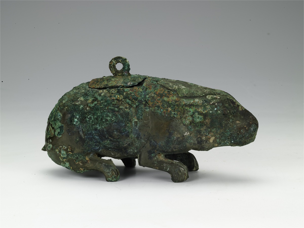 Check out this Western Zhou Dynasty (c.11th century-771 BC) bronze zun (wine vessel) in the shape of a crouching rabbit. Its forelimbs touch the ground and hindlimbs are bent. The hollow rabbit belly serves as a container. There is a rectangular opening on its back, covered by a lid with a round knob. Various patterns appear on both sides of the rabbit’s body.