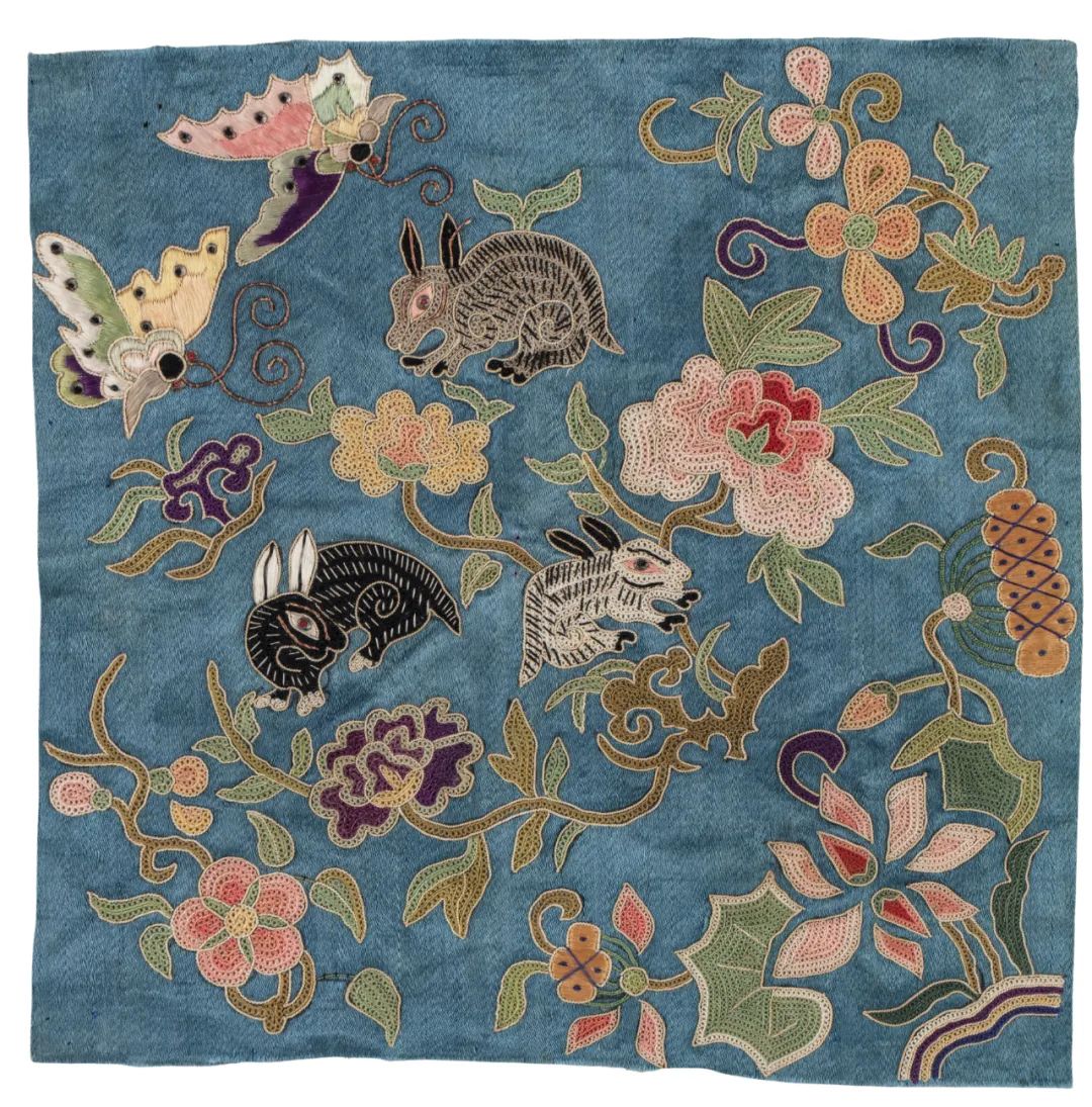Lotuses, peonies, peach blossoms, butterflies and three rabbits have been beautifully embroidered onto the blue background of this Qing Dynasty (1644-1911) embroidery work. A white, a black and a grey rabbit form a triangle. The work, presenting a fine combination of motion and stillness, is part of the permanent collection of the Tsinghua University Art Museum.