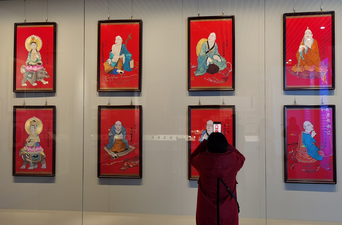 A total of 182 Han embroidery artworks are on display at the Wuhan Museum, showcasing the achievements in Han embroidery protection. [Photo/IC]