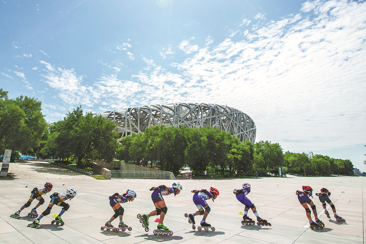 Children skate under a blue sky in Beijing in August. WANG ZICHENG/FOR CHINA DAILY