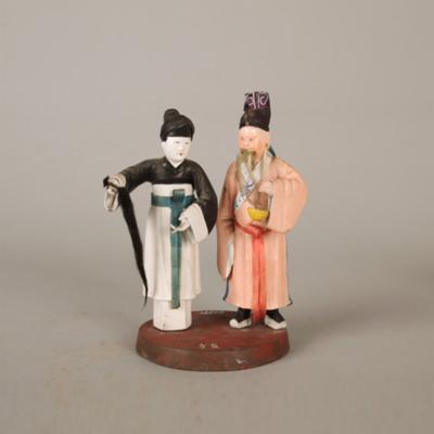 These clay figurines reflect a scene from the Kunqu Opera production Tale of the Pipa, in which the heroine Zhao Wuniang (in white dress and black upper outer garment) wants to sell a strand of hair for money but no one responds to her. The Grandfather Zhang gives her some cloth, money and rice, and Zhao expresses her thanks and asks Zhang to take the hair.