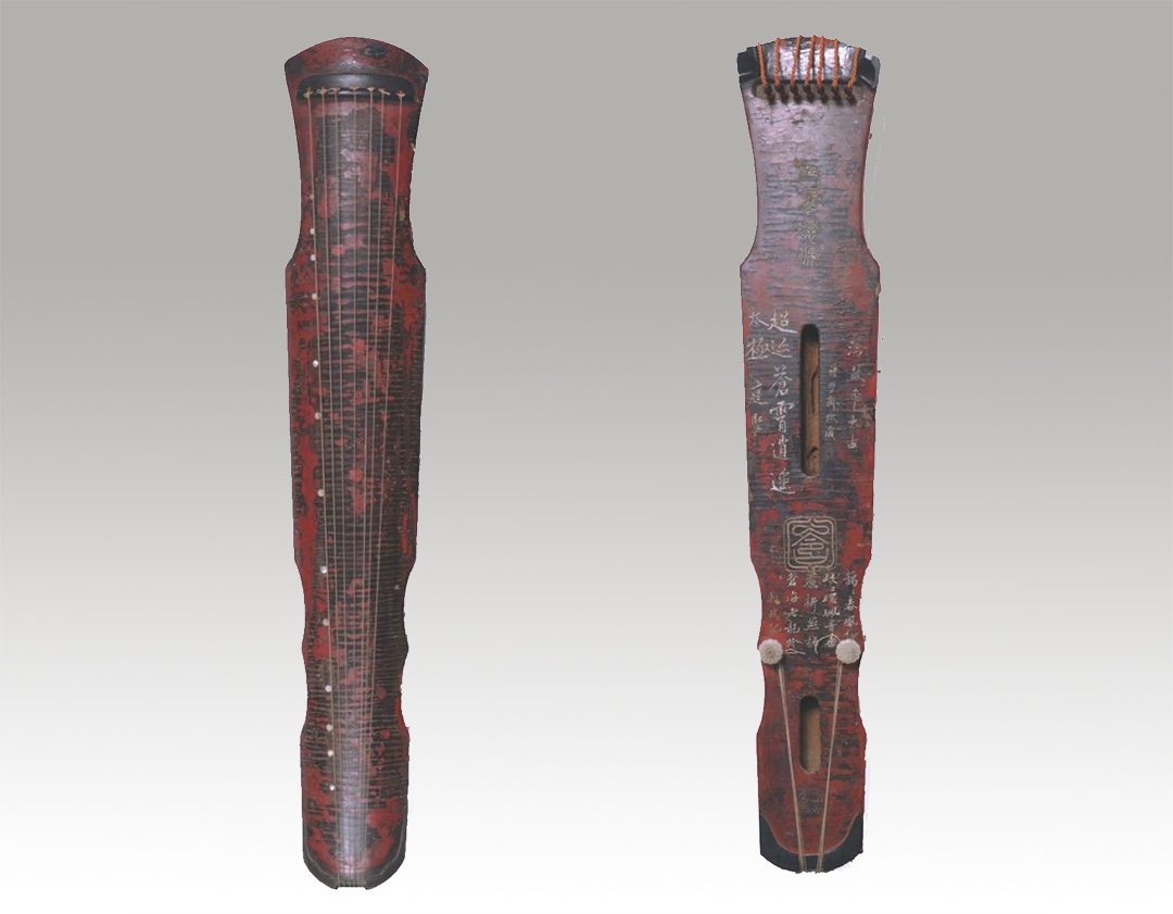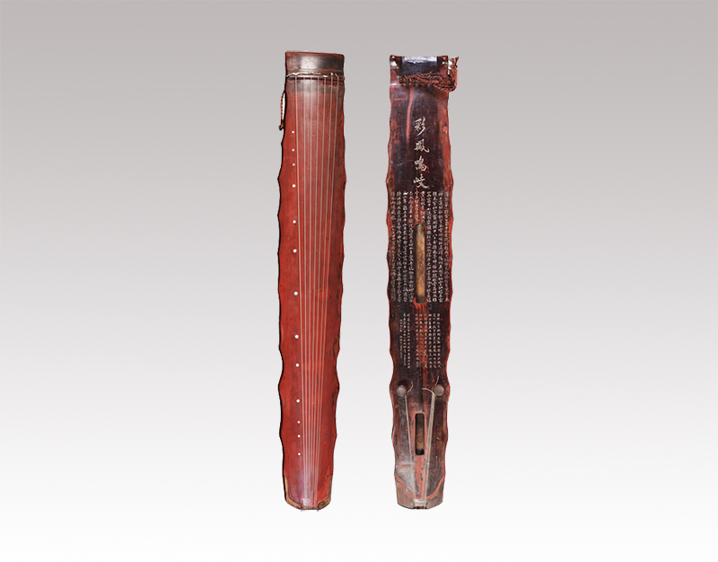 Another cherished example of the guqin from the Tang Dynasty, the Caifeng Mingqi guqin, has a vermilion lacquer coating on the surface and rectangle sound holes. The body of the guqin is thick and the back penal is slightly convex. During manufacturing, it was firstly wrapped with burlap, then coated with a layer of antler ash and finally painted with lacquer. This made its sound more resonant and melodious.