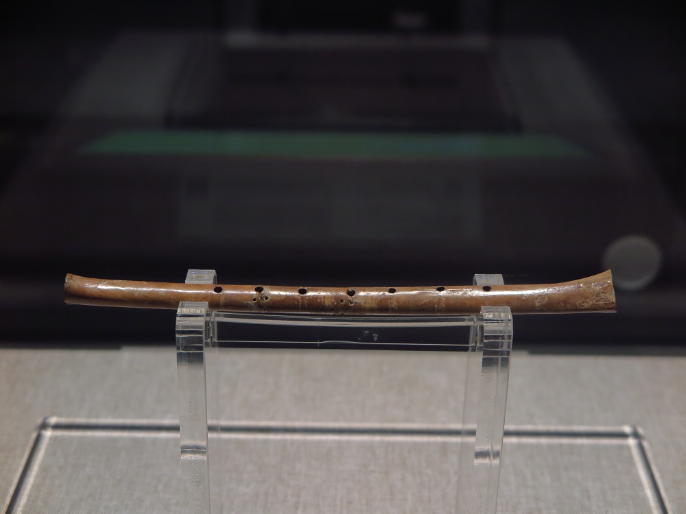 Dating back from 7,800 to 9,000 years ago, the Jiahu ruins site in Central China’s Henan province is a Neolithic settlement site that boasts the most abundant relics from the same period. Thirty--odd flutes made of crane’s ulna bones were unearthed there from 1984 to 1987 and in 2001, most of which have seven holes. One of them, now in the collection of the Henan Museum, is a particularly brilliant example that can play not only five and seven-tone scale music, but also melodies with chromatic tones.
