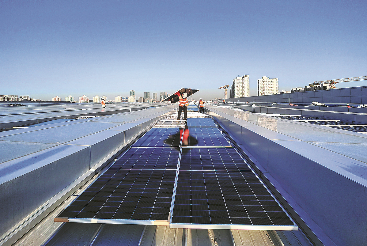 Rooftop photovoltaic panels are installed at the Beijing Fengtai Station during construction in 2021. JIA TIANYONG/CHINA NEWS SERVICE