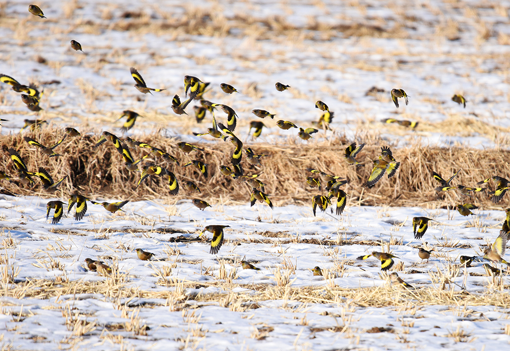 Over a hundred goldfinches forage and frolic in a rice field. [Photo by Yan Changcai & Cheng Changqi/provided to chinaservicesinfo.com]