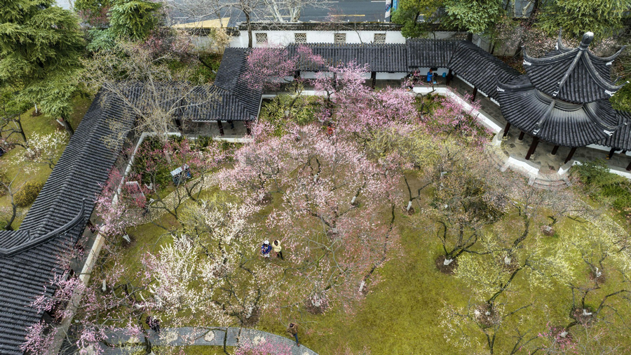 This aerial photo shows tourists enjoying plum blossoms at the Yuhuatai Scenic Area in Nanjing, on Feb 10, 2023. [Photo/Xinhua]