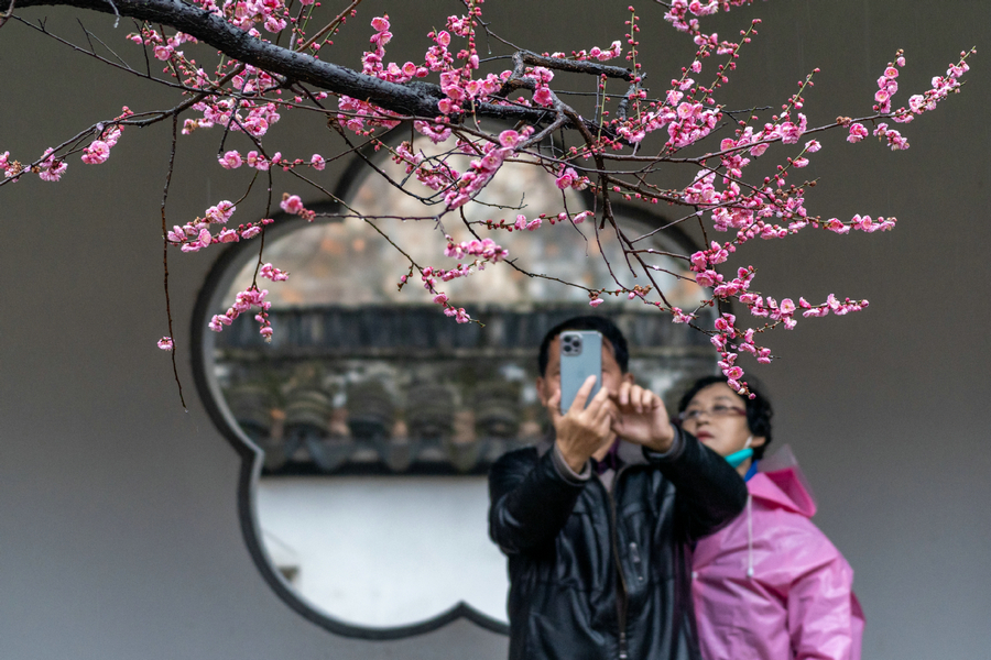 Tourists take photos of plum blossoms at the Yuhuatai Scenic Area in Nanjing, on Feb 9, 2023. [Photo/Xinhua]
