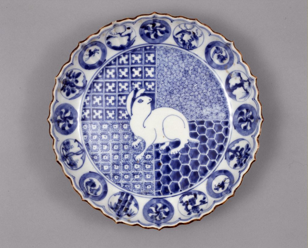 Here is a Ming Dynasty (1368-1644) plate with a flower-shaped brim. Sixteen flower, bird, rock and bamboo patterns decorate the inside of the plate. Four geometrical patterns in the center surround a white rabbit.