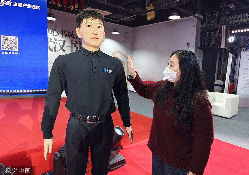 A woman touches a robot in Wuhan, Hubei province, on Jan 15, 2023. [Photo/VCG]