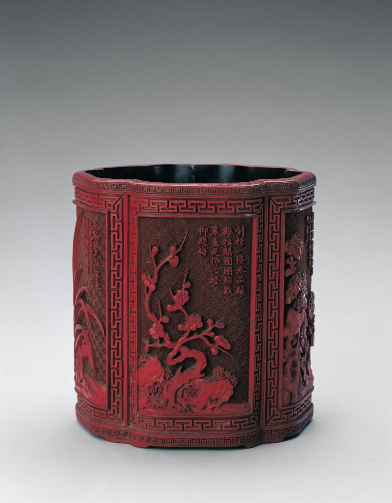 This red-lacquer brush pot with a five-petal-shaped mouth is delicately designed. Five kinds of flowers, namely the narcissus, sweet osmanthus, plum blossom, chrysanthemum and orchid, each with a poem composed by Emperor Qianlong (r. 1736-1795), are carved in separate panels on the outer sides.