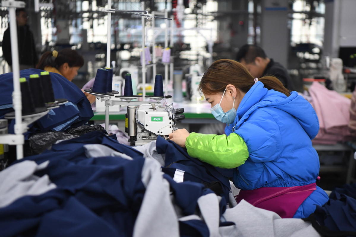Workers produce clothes at a workshop in Zhuzhou, Hunan province, on Feb 15. [Photo/Xinhua]