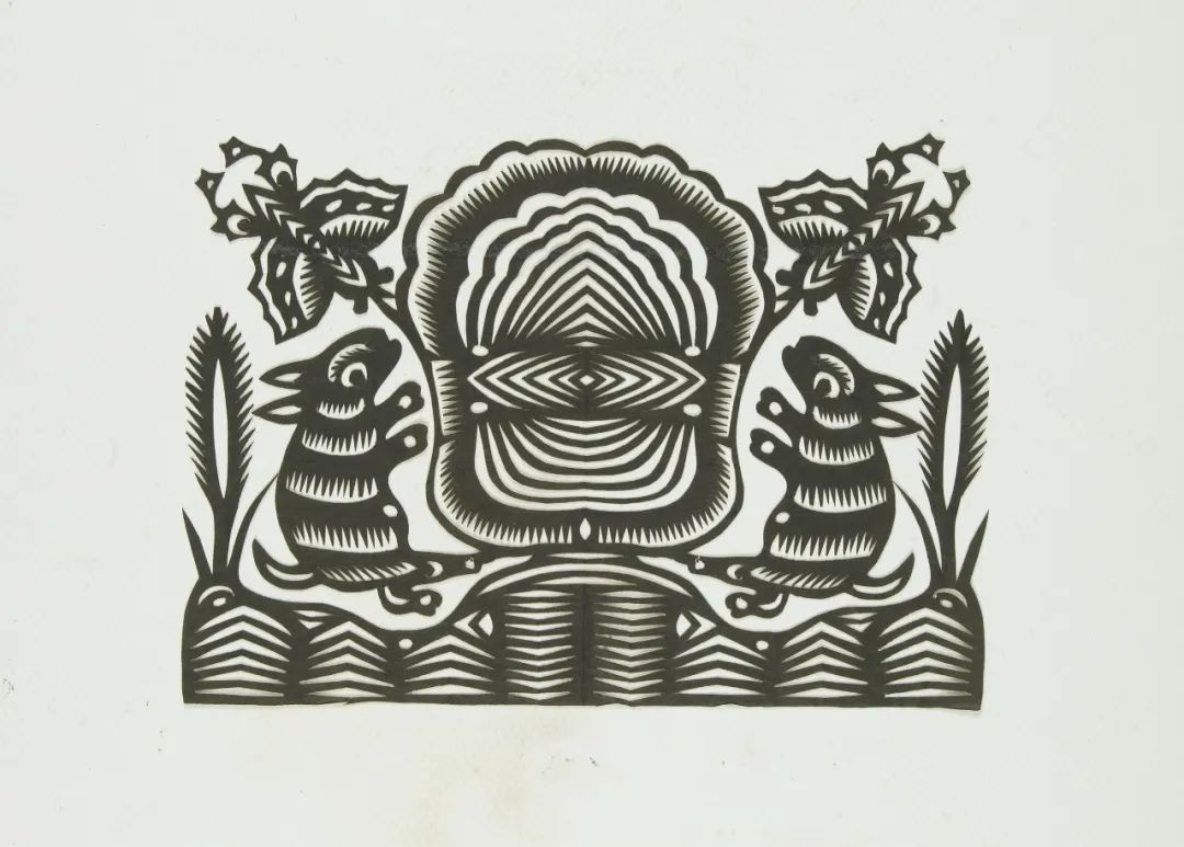 In Chinese folk art, a rabbit holding cabbage represents wishes for reproduction and health. This is a paper-cutting created by Qin Xue’e, an intangible cultural heritage inheritor from Xunyi county of Shaanxi province. It depicts two rabbits and two butterflies symmetrically distributed on two sides of a cabbage.