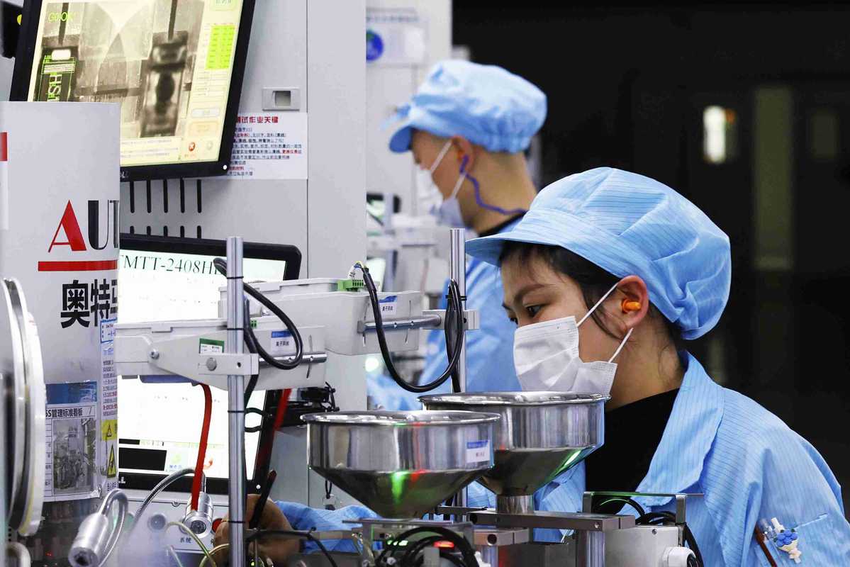 Employees work on a production line of export-bound electronic devices in Suqian, Jiangsu province, on Feb 7. XU CHANGLIANG/FOR CHINA DAILY