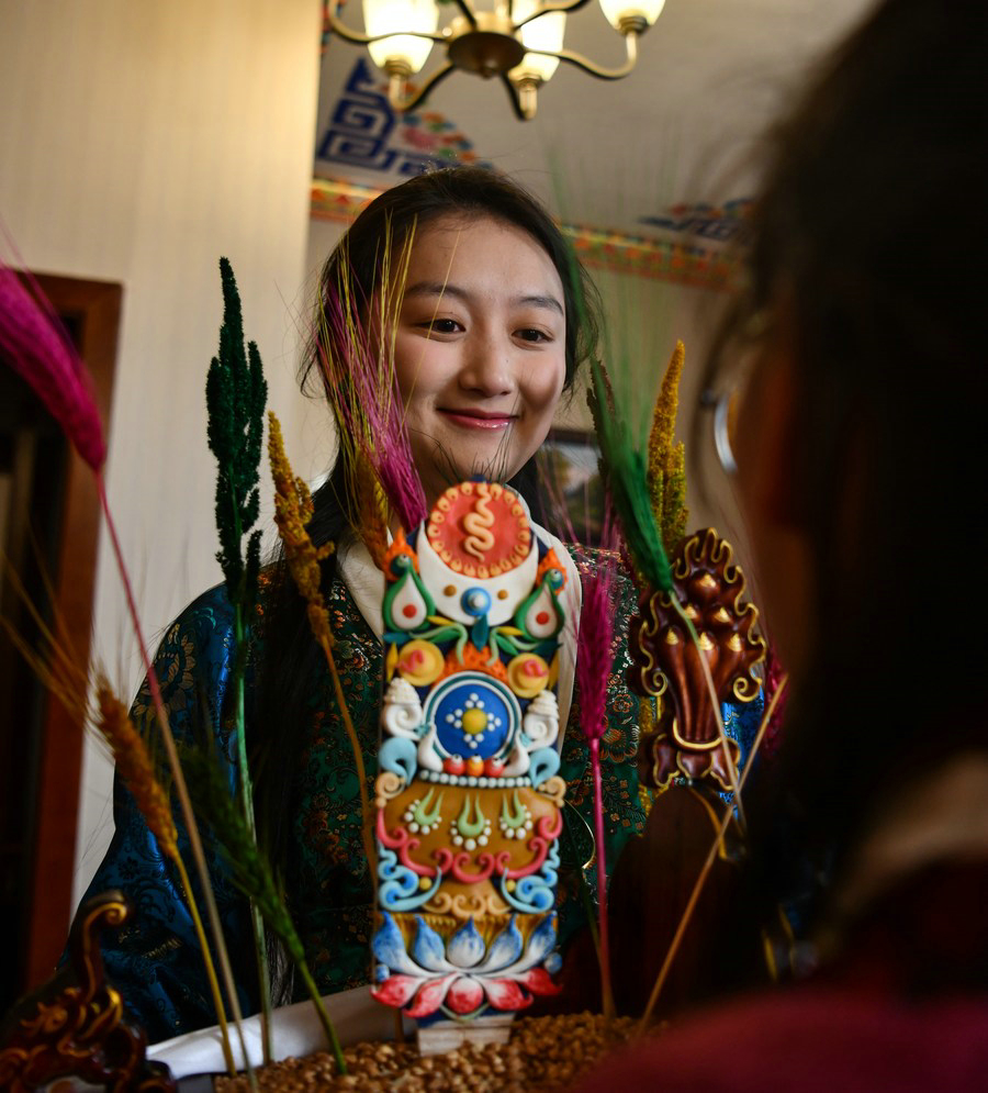 Across Barkhor Street in downtown Lhasa, decorations such as red Tibetan New Year couplets, exquisite chema boxes (a two-tier rectangular wooden box containing roasted barley and fried wheat grain), auspicious sheep heads, colorful dyed flowers accompanied the hustle and bustle of large shopping crowds.