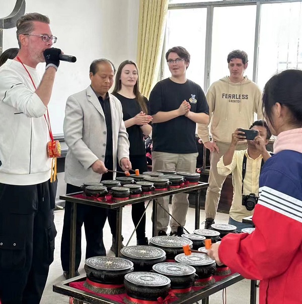 On Feb 20, in the bronze drum performance classroom of the Donglan Middle School for Nationalities, 12 students played the toasting song and Hechi folk songs. Clinton Legrand Moore from the US sang a toast song accompanied by bronze drums, winning applause from the assembled crowd.
