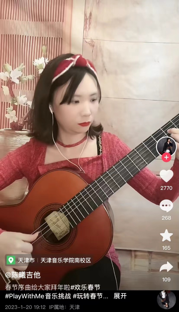 Guitarist Chen Xi staged a guitar solo. A creative performer experienced in cross-border arts, Chen is a veteran of integrating traditional Chinese instruments into her performances. Her solo won praise on Douyin, the Chinese version of TikTok. "It's sometimes cheerful and bright, sometimes soft and romantic...There was a strong Chinese flavor in it", internet user Yanhuayileng commented.