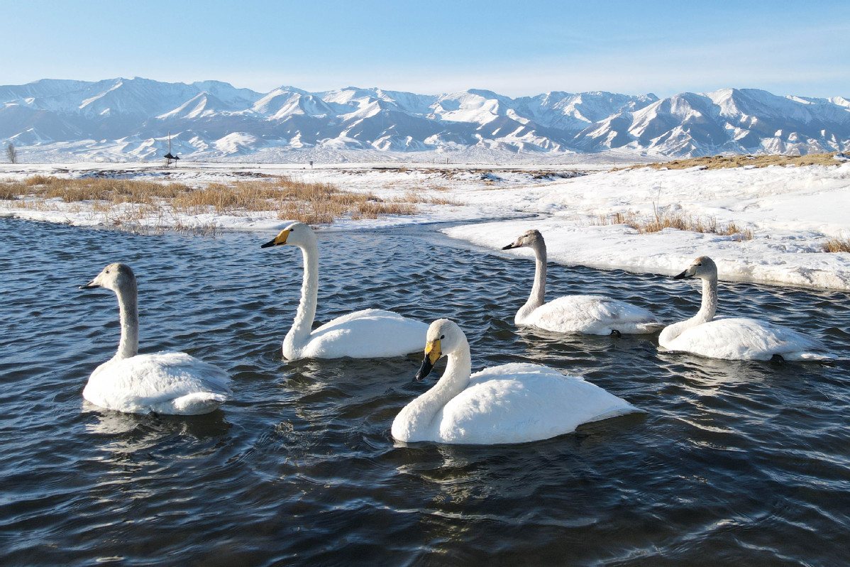 In the Gaojiahu scenic area, Barkol county, Hami, Xinjiang Uygur autonomous region, several graceful swans were recently spotted foraging on the blue waters with stunning snow-capped mountains in the background. What a view!