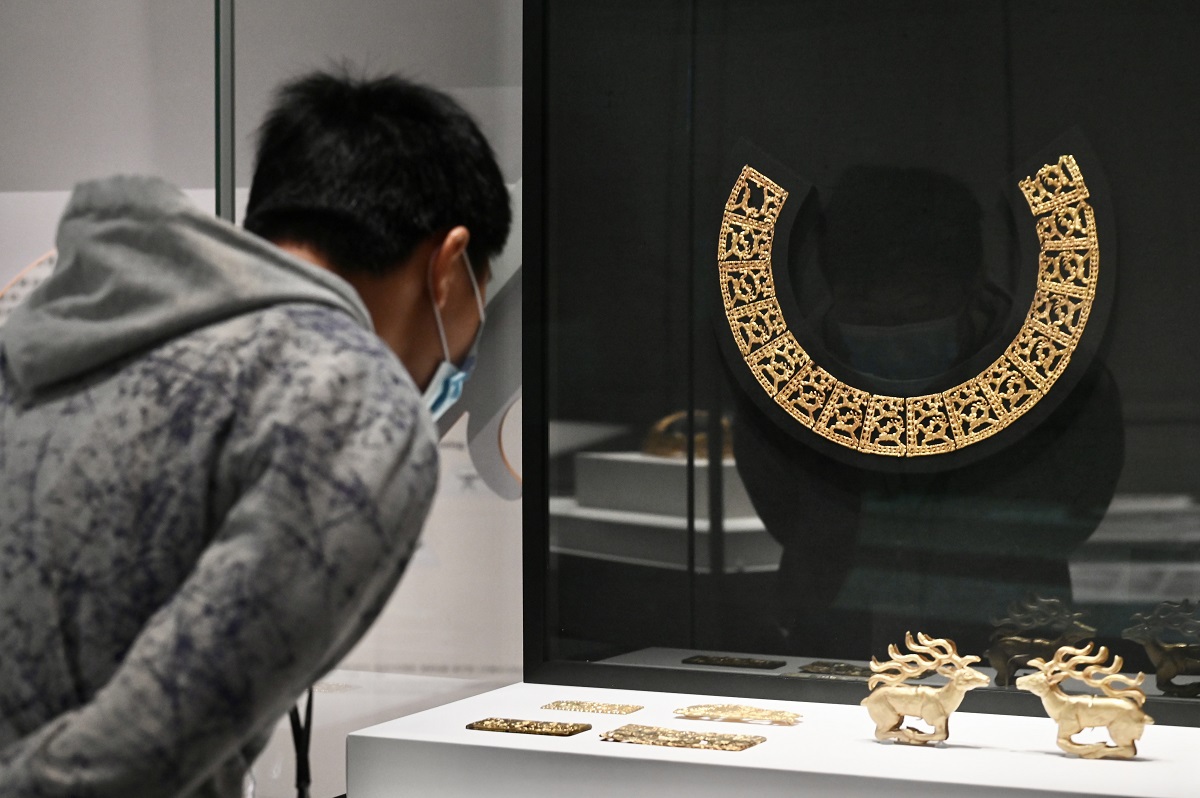 A visitor examines gold artifacts at the Hong Kong Palace Museum. [Photo/IC]