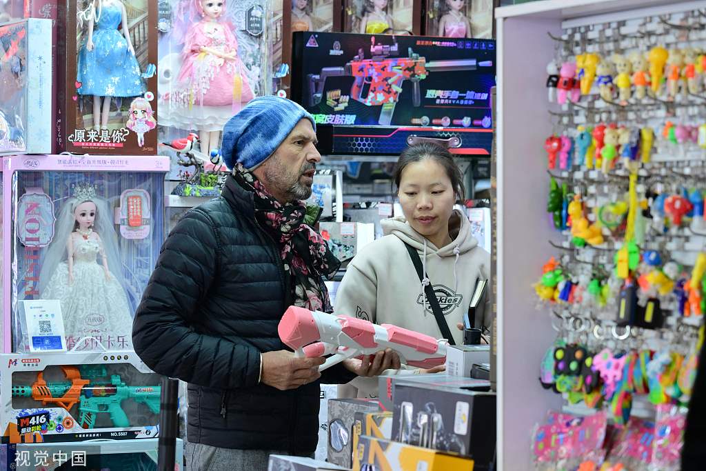 A foreign businessman selects children's toys at a store at Yiwu International Trade City in Yiwu, Zhejiang province on Feb 22, 2023. [Photo/VCG]