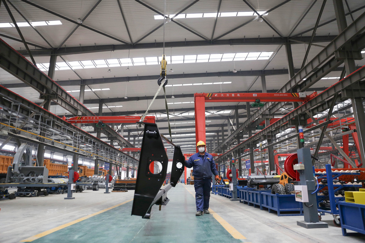 A worker moves a component at a machinery workshop in Fuxin, Liaoning province on Feb 22, 2023. [Photo/Xinhua]
