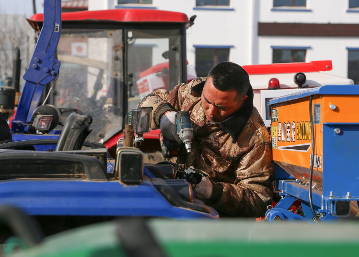 A technician fixes the farming machinery for rural residents in Fuxin, Liaoning province on Feb 23, 2023. [Photo/Xinhua]