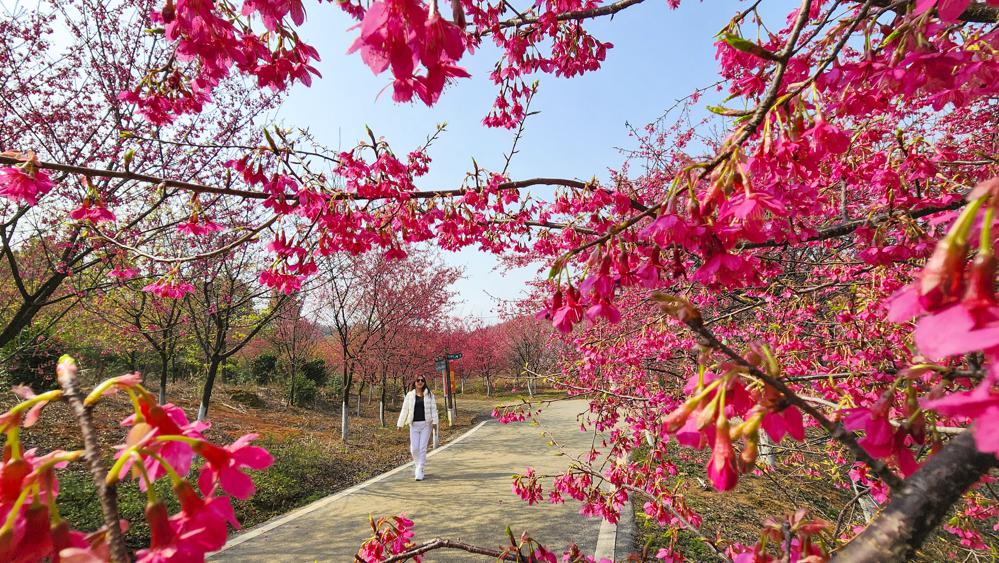 Cherry trees blossomed at a park in Luoqiao town, Changning, Hunan province, recently, attracting many tourists.