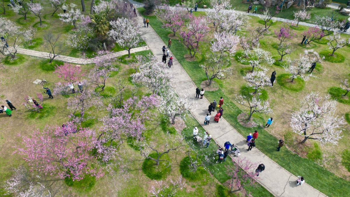 An aerial photo on Feb 24, 2023, shows the East Lake Plum Garden in Wuhan, Central China's Hubei province. More than 20,000 plum trees bloom in the garden, attracting tourists from all over the country to visit and appreciate the plum. [Photo by Zhu Xingxin/chinadaily.com.cn]