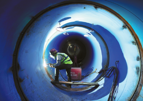 A technician from Sinohydro Bureau 14 Co Ltd, a subsidiary of Power Construction Corp of China, or PowerChina, welds a pipe for water transport in Chongqing in October. [CHEN SHICHUAN/FOR CHINA DAILY]