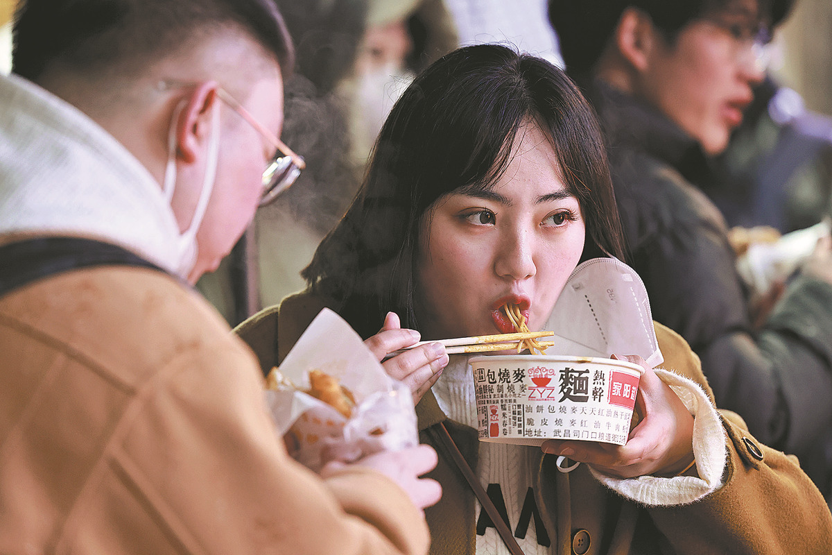 People enjoy food at a snack bar on Liangdao Street in Wuhan, Hubei province, on Feb 23. ZHU XINGXIN/CHINA DAILY