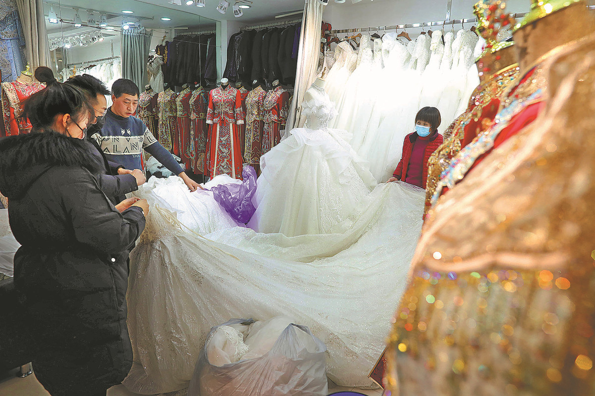 Customers choose a wedding veil at a store in a shopping center on Feb 23. ZHU XINGXIN/CHINA DAILY