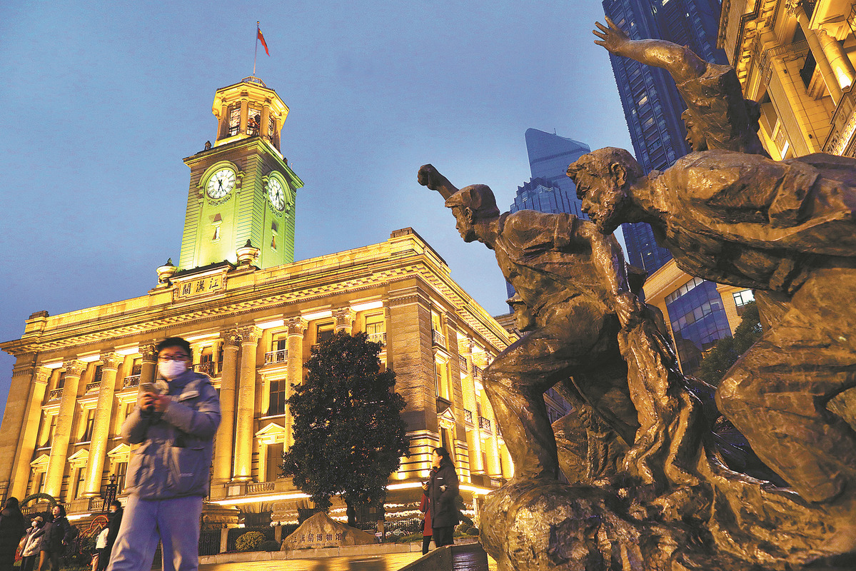 A resident passes the Hankow Customs House, one of Wuhan's landmarks, on Feb 23. ZHU XINGXIN/CHINA DAILY