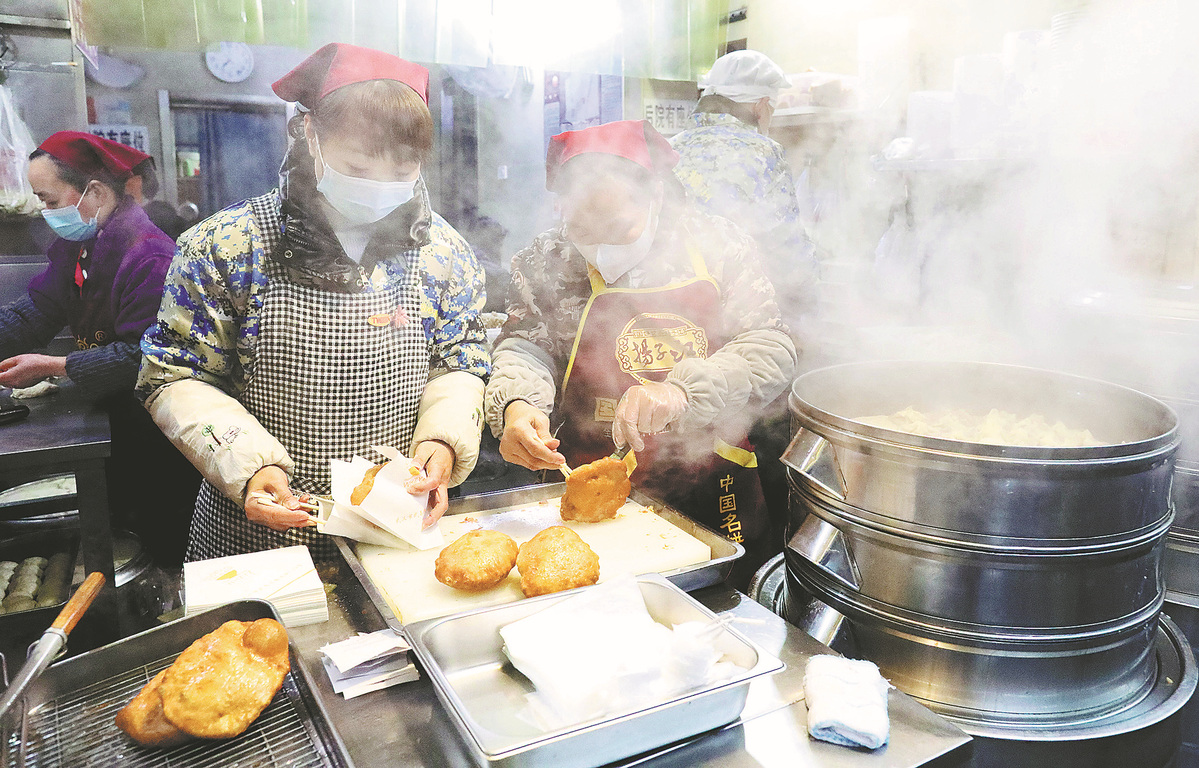Chefs cook at a snack bar on Liangdao Street on Feb 23. ZHU XINGXIN/CHINA DAILY