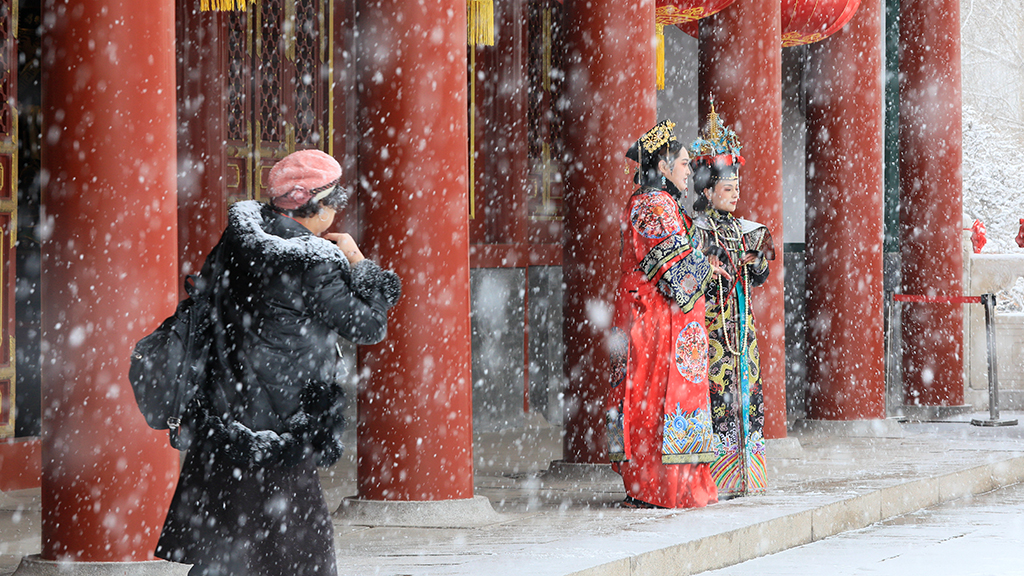 Tourists dress in palace clothes to visit the Confucius Temple in Harbin, Heilongjiang province on a snowy day. [Photo/IC]