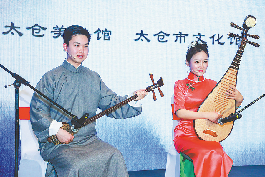 Musicians perform Suzhou Pingtan, a regional variety of music popular in the Jiangnan Region (south of the Yangtze River) with traditional Chinese instruments such as the three-stringed sanxian and pipa (Chinese lute), at the opening ceremony of the Taicang Art Museum, located in Taicang, Jiangsu province. CHINA DAILY