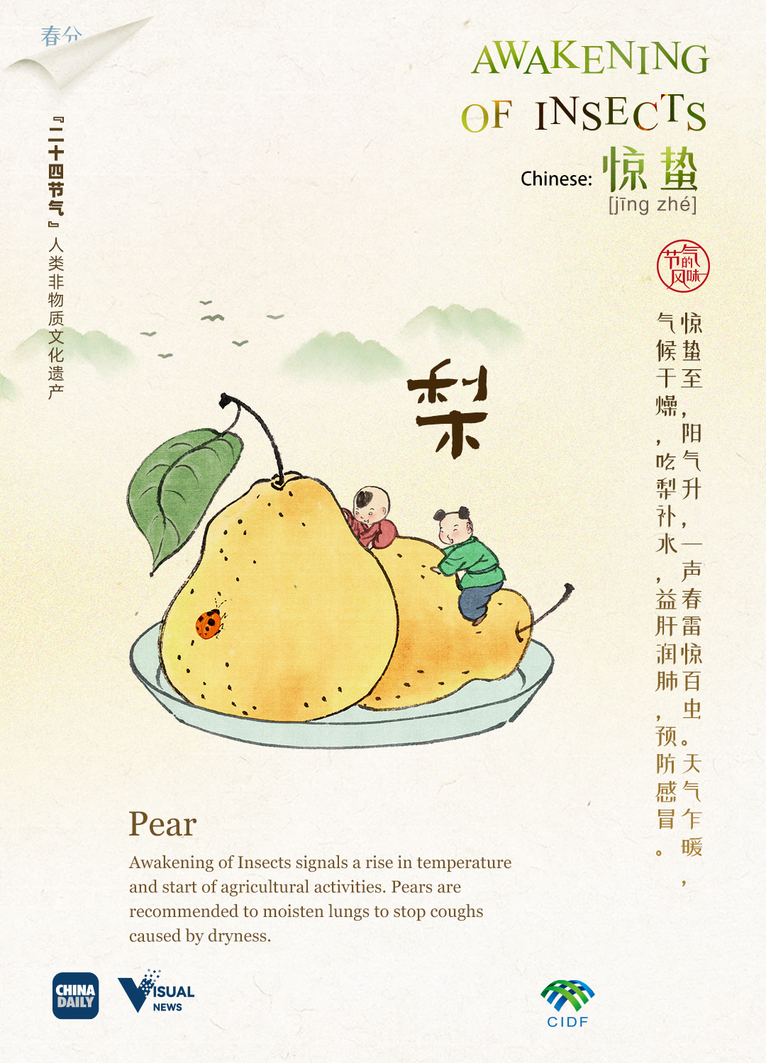 The traditional Chinese solar calendar divides the year into 24 solar terms. Awakening of Insects (Chinese: 惊蛰) falls on March 6 and ends on March 20 this year.