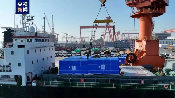 On March 1, 225 sets of box houses, aided by China as part of its emergency assistance to quake-hit victims in Syria, were loaded and shipped out from a port in North China's Tianjin municipality.