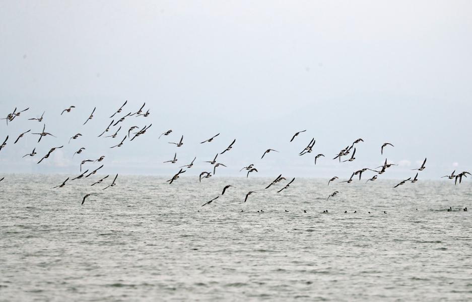 A flock of wild ducks fly over Ninghai Bay in Ningbo, Zhejiang province. [Photo by Li Jianglin/For chinadaily.com.cn]