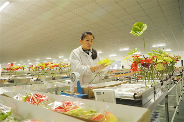 Women package fresh flowers that will be shipped to Japan at a workshop in Lanling county of Linyi, Shandong province. Local governments are developing the flower industry to provide more jobs to local women. [Photo by Feng Lei/For chinadaily.com.cn]