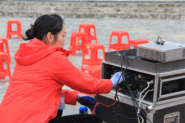 A member of a female projection team at Yunyang district of Shiyan, Hubei province, puts film projection equipments in place on a square in the district. The team has brought thousands of films to communities over the past 16 years, enriching recreation choices for residents. [Photo by Li Shangfei/For chinadaily.com.cn]