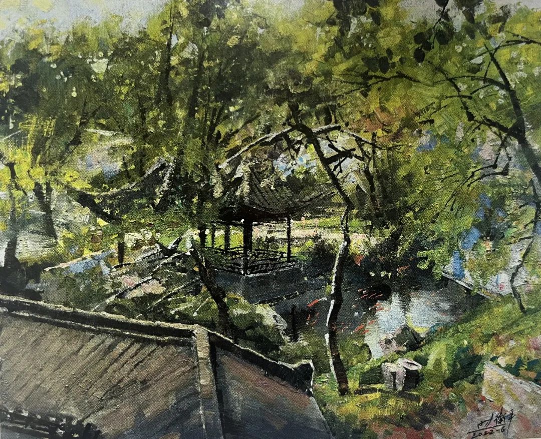Oil painting by Shi Weiping depicting a garden in Yangzhou, 2022 [Photo/Official WeChat account of the Suzhou Art Museum]