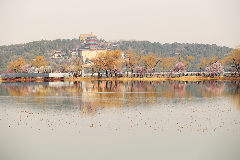 Spring has arrived at the Summer Palace in Beijing! The mountain peach blossoms are in full bloom with the lake water reflecting their beautiful colors. The ancient pavilion is surrounded by willow branches, creating a stunning golden scenery.